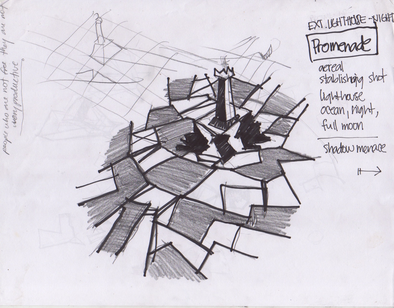 (Gnomus 2:34) Giant waves climb to the Lighthouse trying to kill the Light. The FORM is asleep inside the Lighthouse. Foreseeing the damage, The SHADOW splits and becomes alive detaching from the Form. The alive Shadow goes out to protect the light when big waves drag him out into the water. (Promenade 01:00) The Shadow falls unconscious deep underwater.