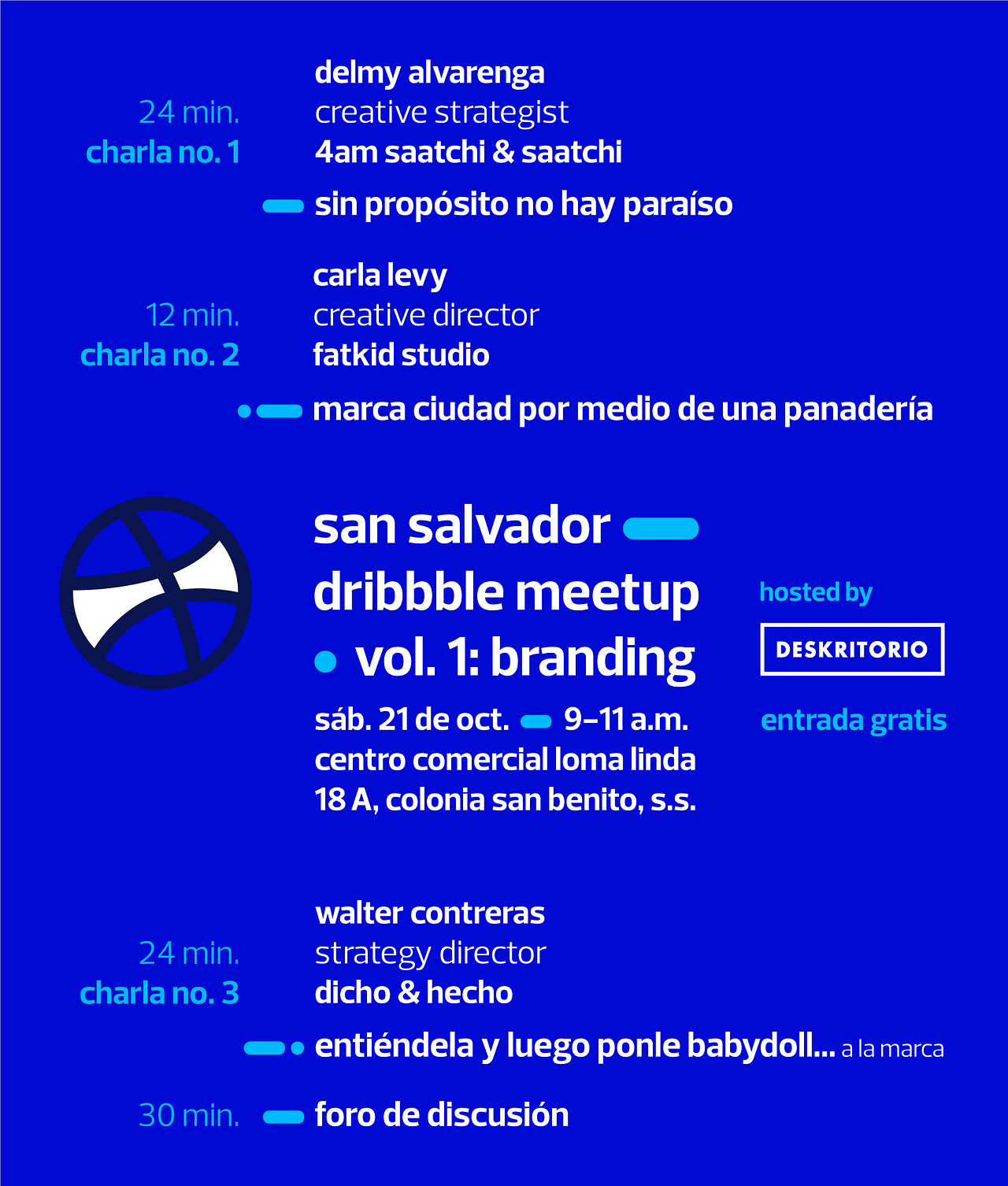 En Octubre tuve el honor de participar en el primer Dribbble Meet-Up en San Salvador, El Salvador, donde junto con otros 2 estrategas y creativos, compartimos nuestras experiencias y los procesos creativos de estrategia y creación de marcas.